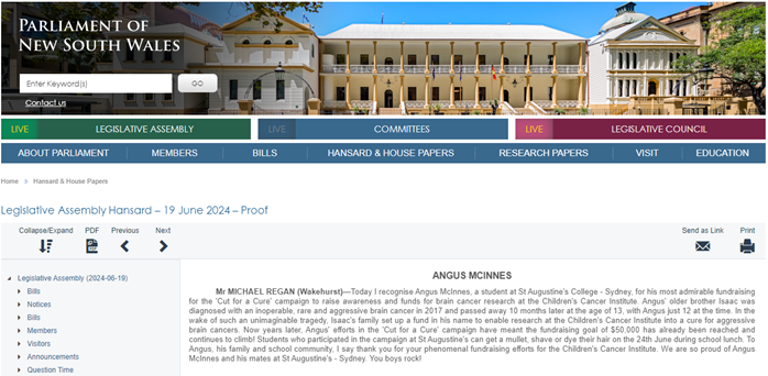 The SRC supported Angus McInnes in his Cut for a Cure fundraiser in memory of his brother Isaac who passed away due to an aggressive brain tumour. The SRC collected $5.00 from every student who wore mufti on the last day of Term 2. Angus McInnes, Head Prefect and Heavey House Captain’s fundraising efforts together with the St Augustine’s College community reached a staggering $80,000. This shows amazing community spirit with students, parents, staff and families all donating funds. This attracted media attention which then led to a Community Recognition Statement by Member for Wakehurst, Michael Regan MP, in NSW Parliament’s Legislative Assembly and Hansard report.